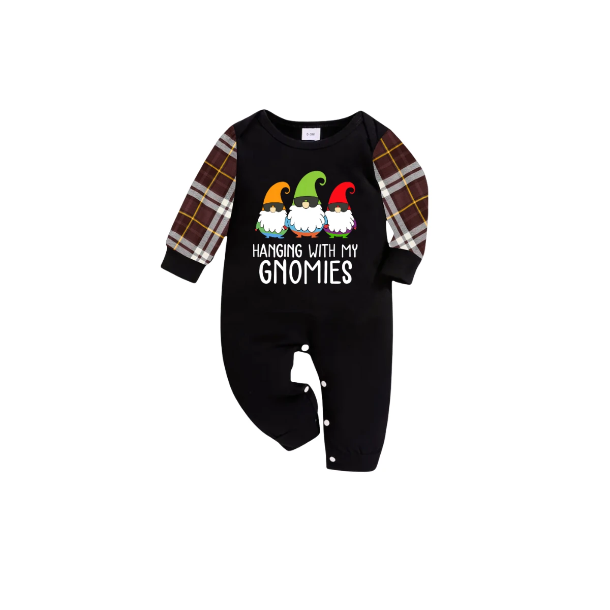 Hanging With My Gnomies Christmas 2025 Family Pajamas Set - Black Top, Brown Pants, Brown Plaid Sleeves