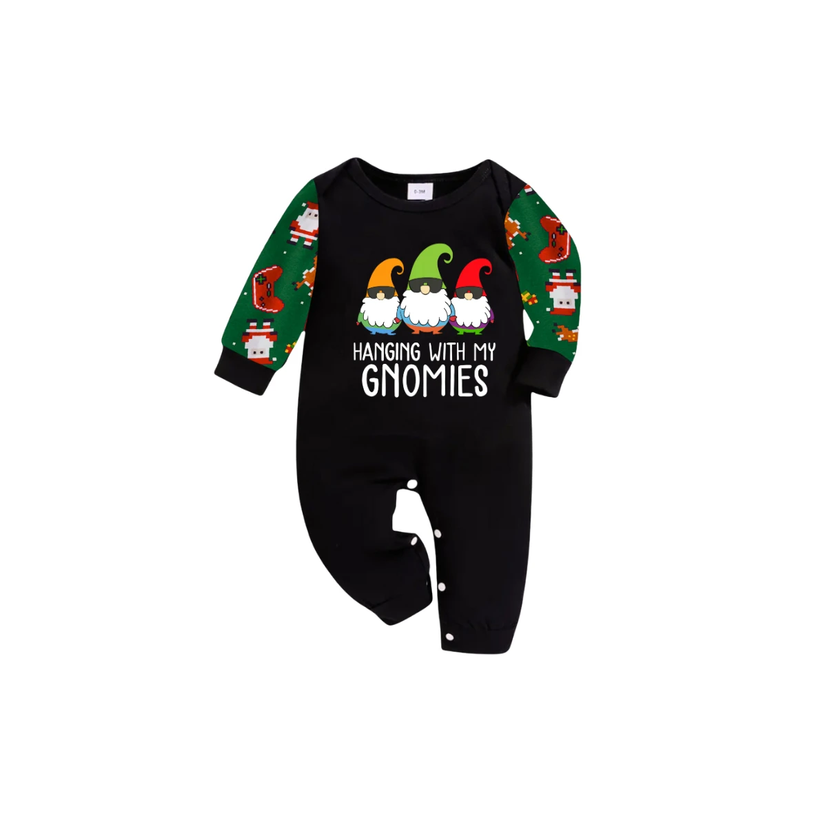 Hanging With My Gnomies Christmas 2025 Family Pajamas Set - Black Top, Green Pants, Green Christmas Cartoon Sleeves