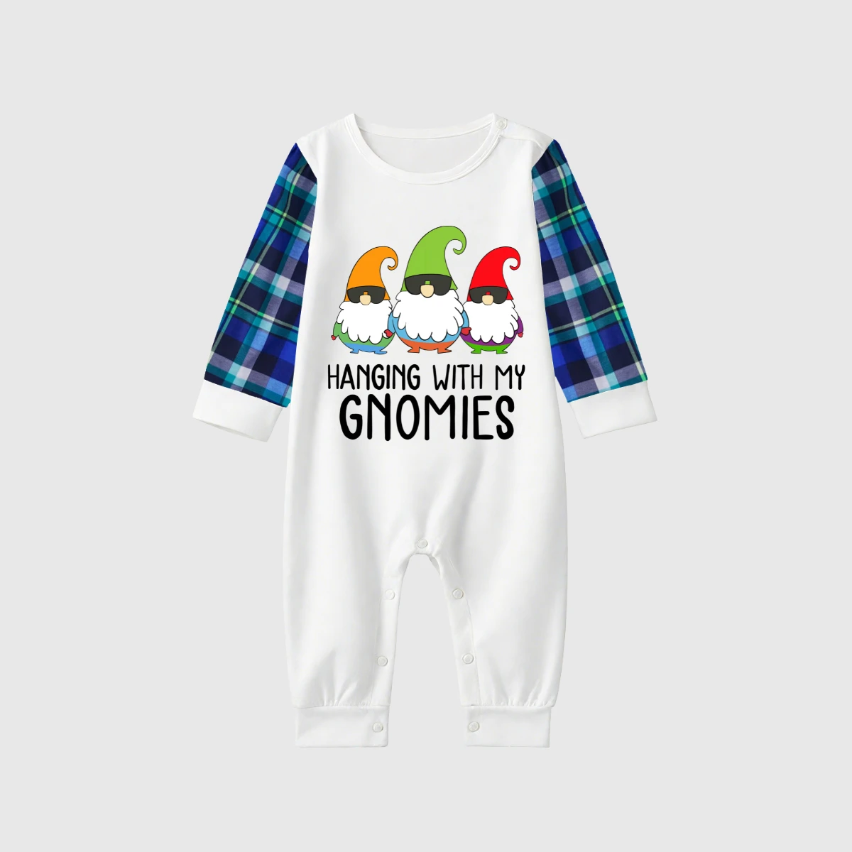 Hanging With My Gnomies Family Pajamas Set - White Top, Blue-Green Plaid Pants, Blue Solid Sleeves, Gnomes Print