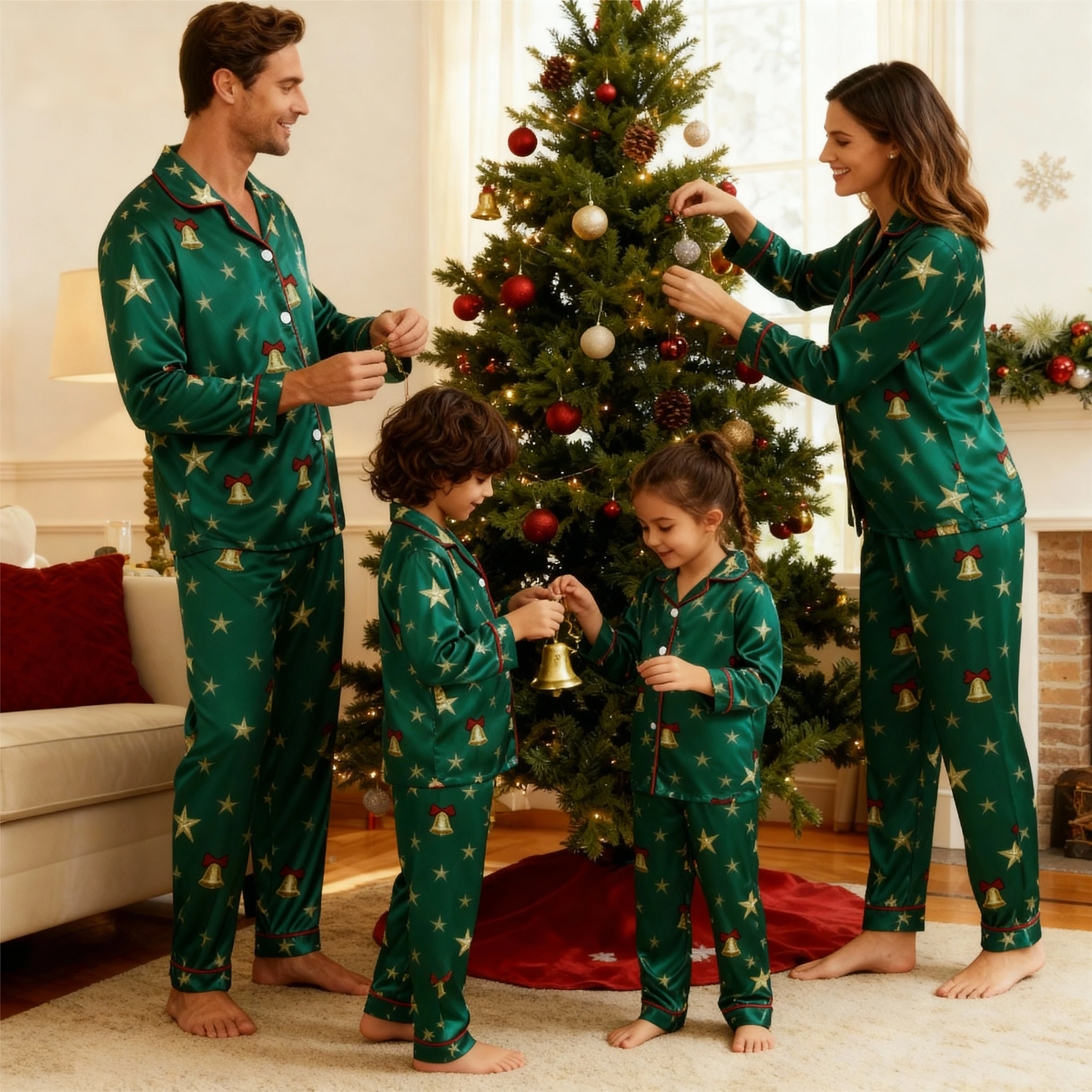 Holiday Family Button-down Green Satin Christmas Pajamas Set