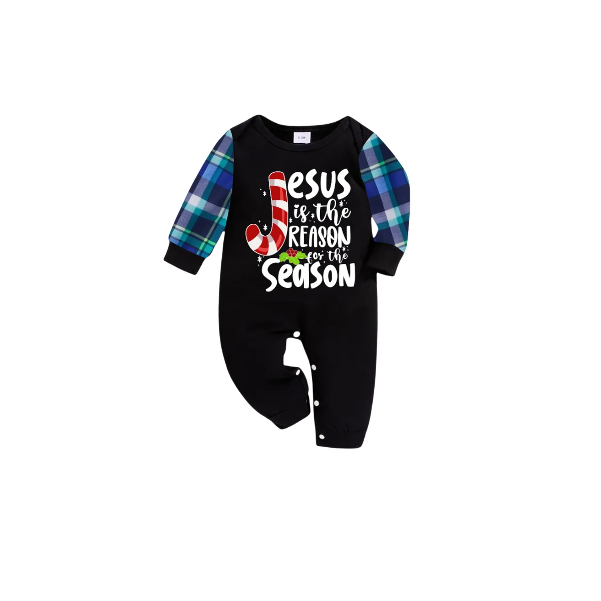 Jesus is the Reason Blue Plaid Christmas Pajama Set with Festive Candy Cane Sleeves