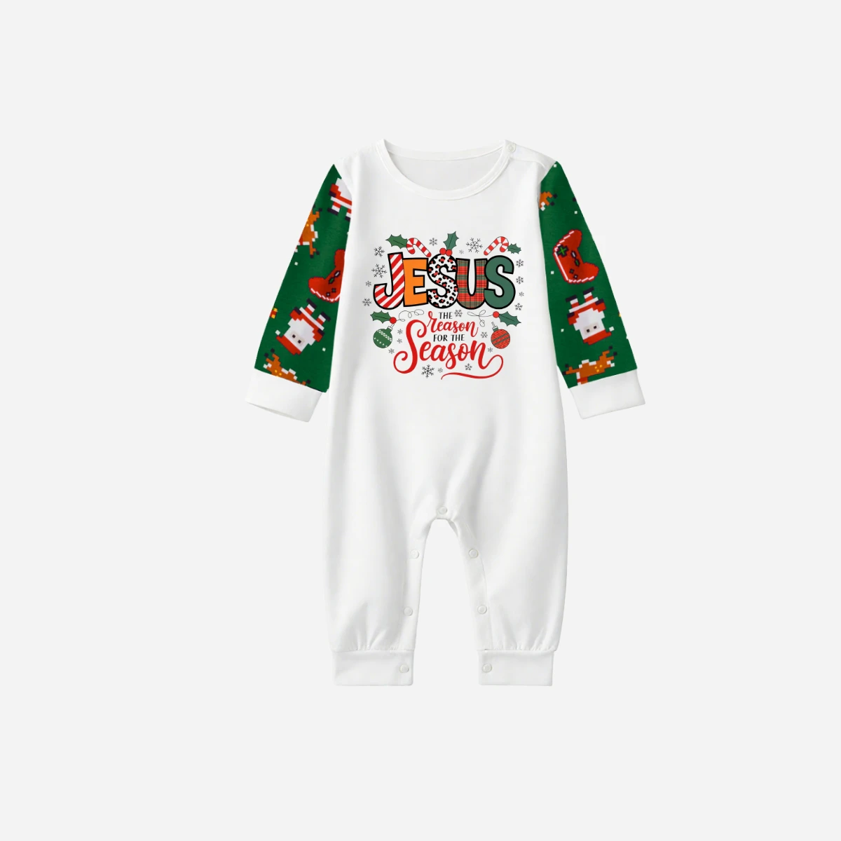"Jesus is the REASON for the Season" Matching Christmas Pajamas Set - Green Raglan Sleeves Santa Print Pants Pajamas