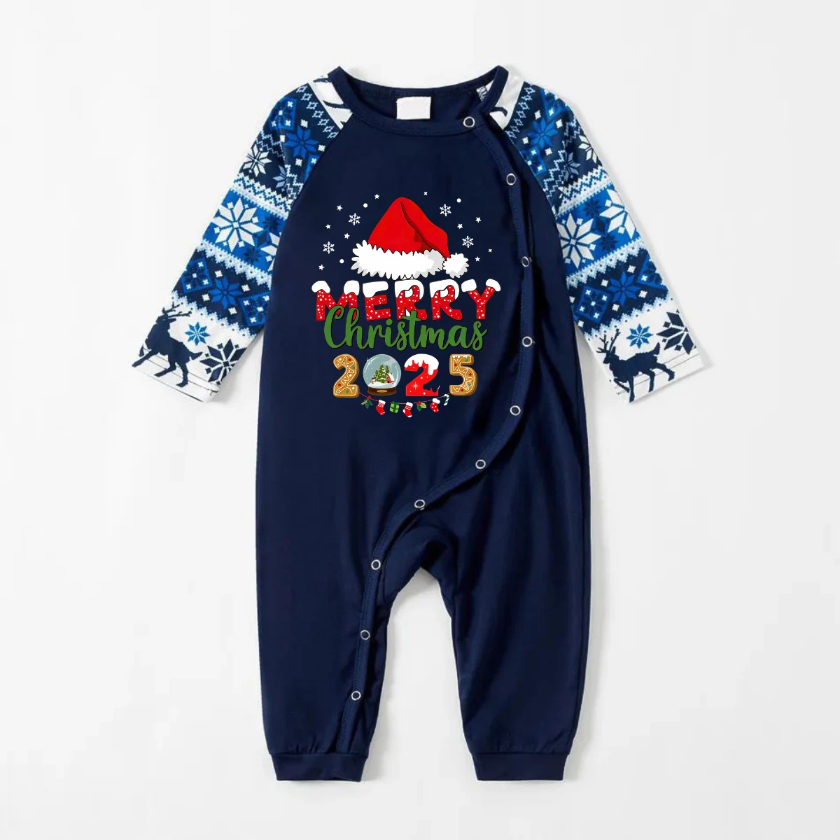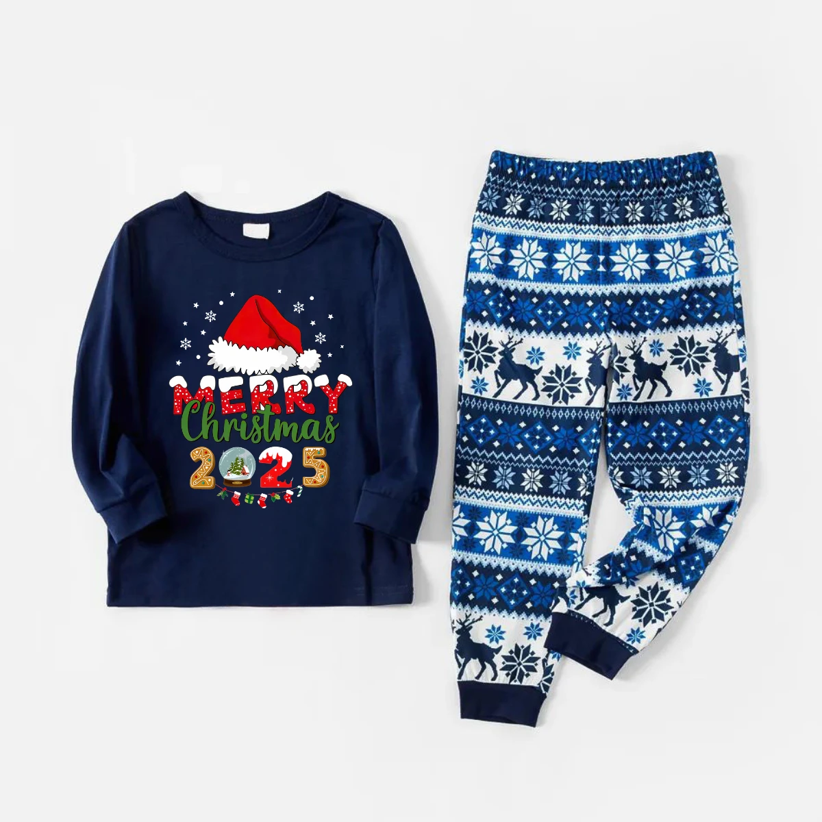 Joyful Blue Christmas Pajamas Set With Santa Hat and "Merry Christmas 2025" Text Print