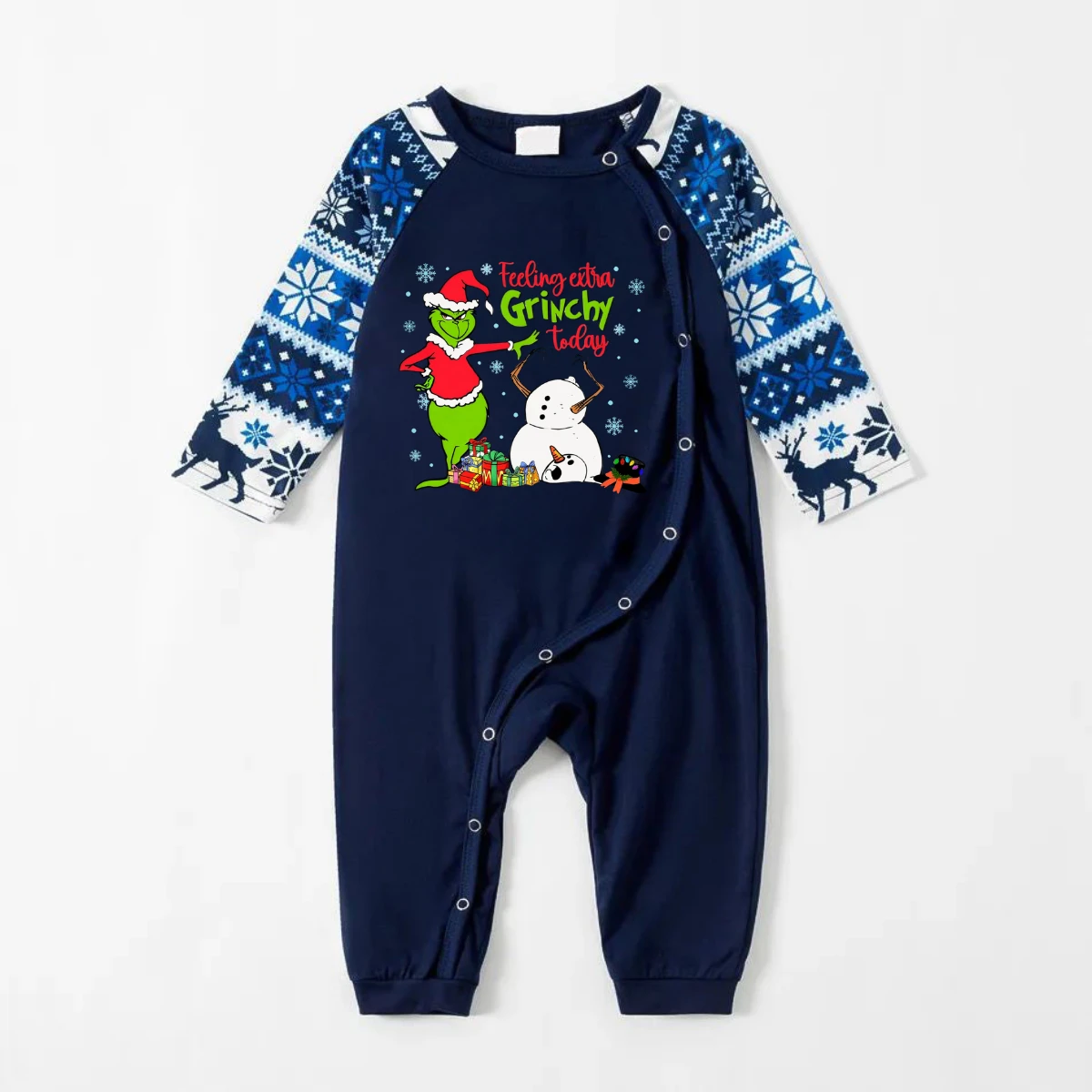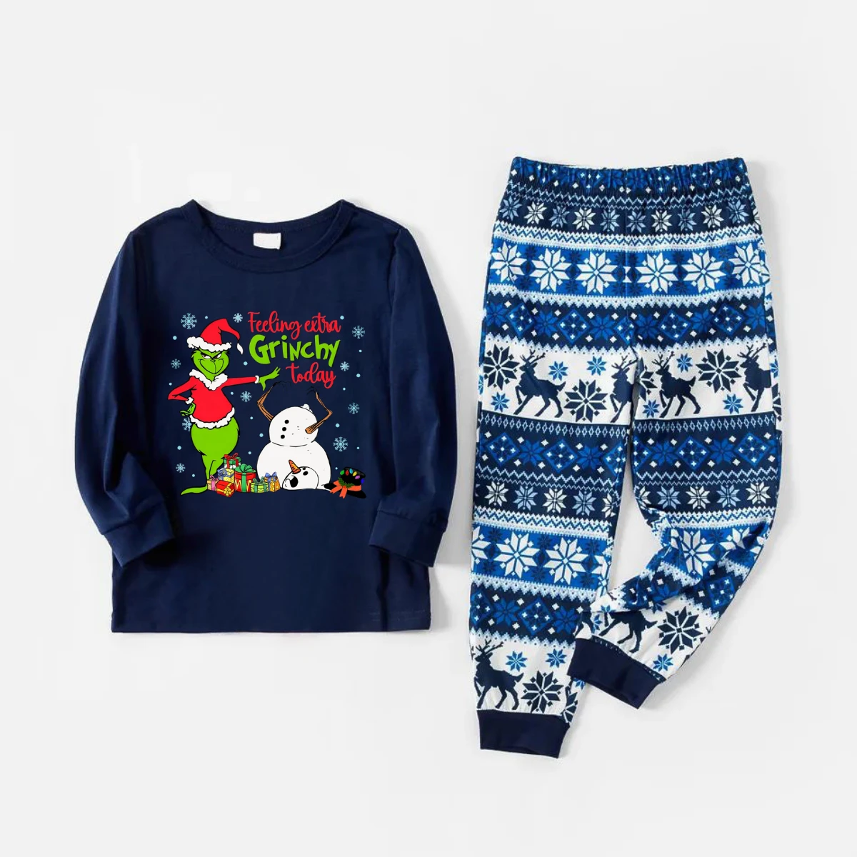 Joyful Blue Christmas Pajamas Set With Grinch and Snowman Print