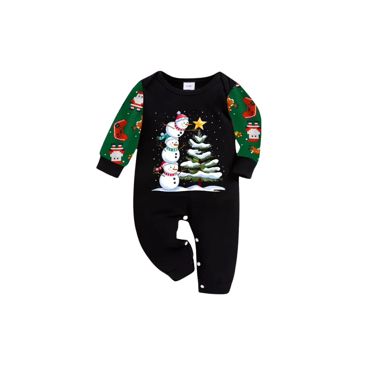 Joyful Green Color-Blocked Christmas Pajamas Set with Snowman & Christmas Tree Print