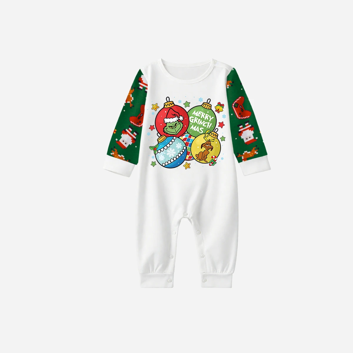Joyful Green Raglan Top Christmas Pajamas Set With Ball Ornaments and Grinch Print