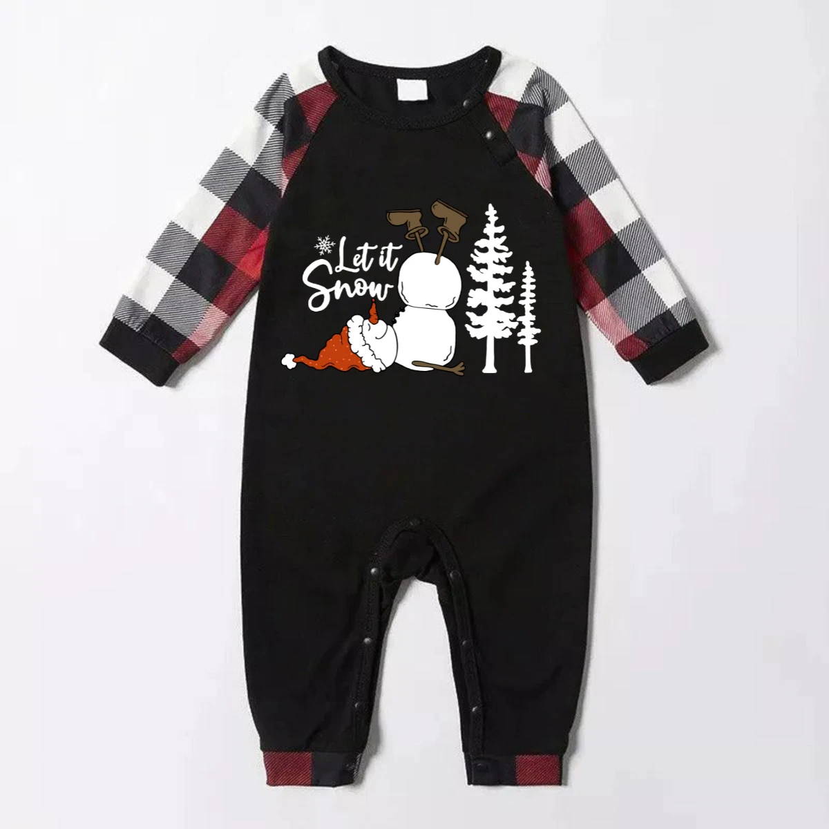 Description: Celebrate the season in cozy style with our "Let It Snow" snowman-patterned family matching pajamas! Featuring a cheerful snowman design and festive "Let It Snow" lettering. these pajamas come with contrasting red. black. and white plaid sleeves for a classic holiday look. Crafted for comfort and warmth. this set is perfect for family gatherings. movie nights. and holiday photos.