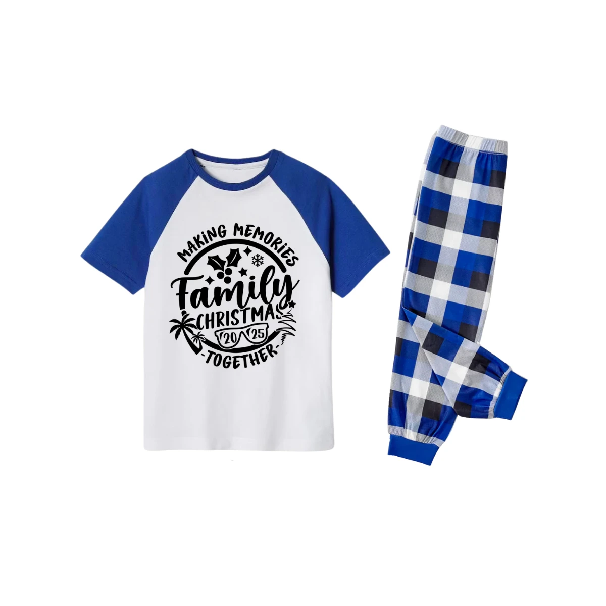 Making Memories Together Family Christmas 2025 Pajamas Set - White Top Blue Sleeves Blue Plaid Pants Black Text Graphic