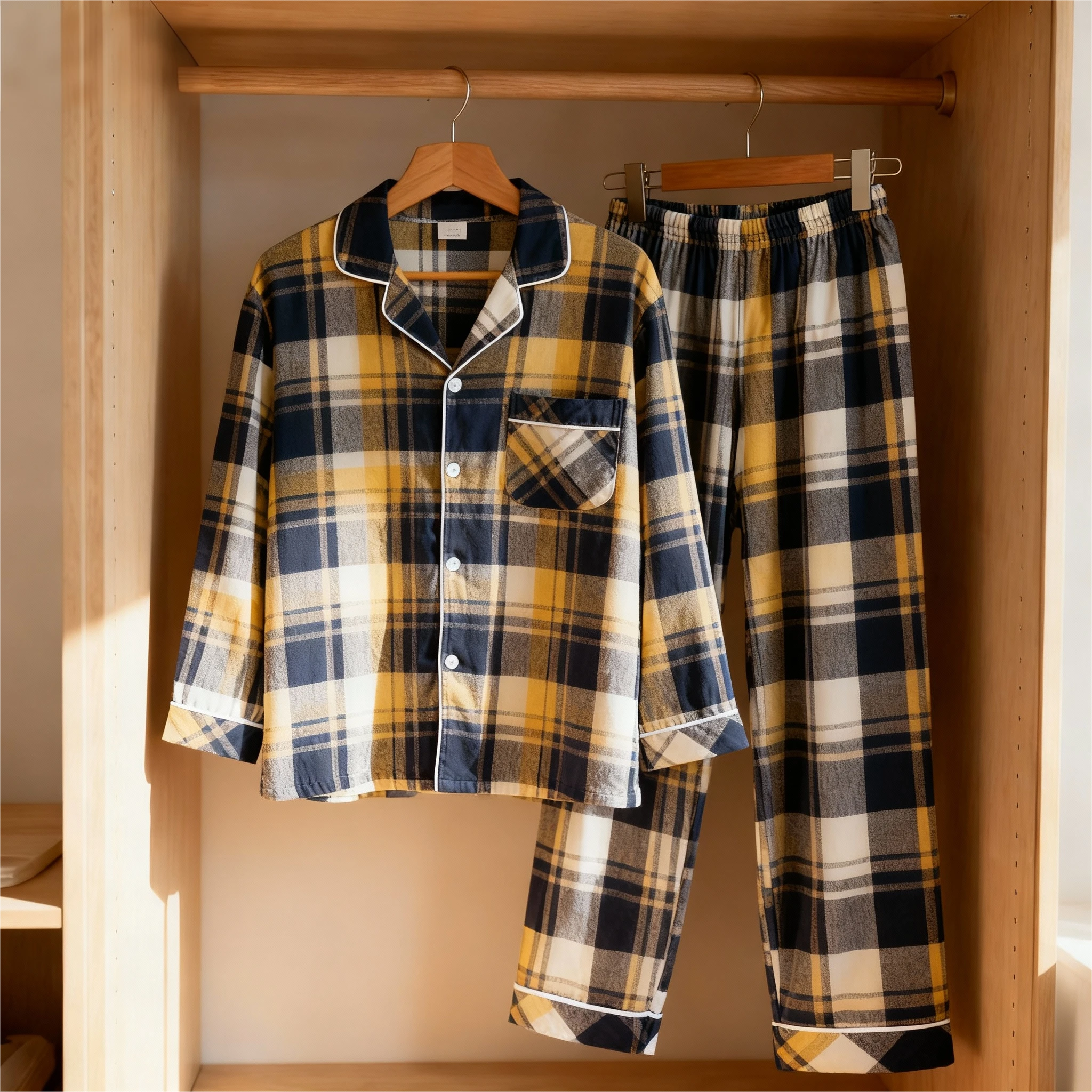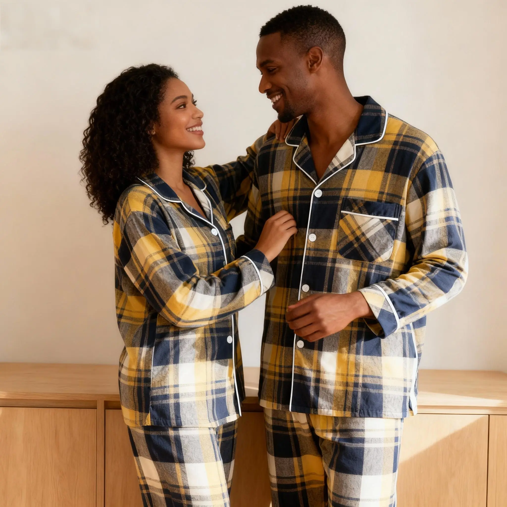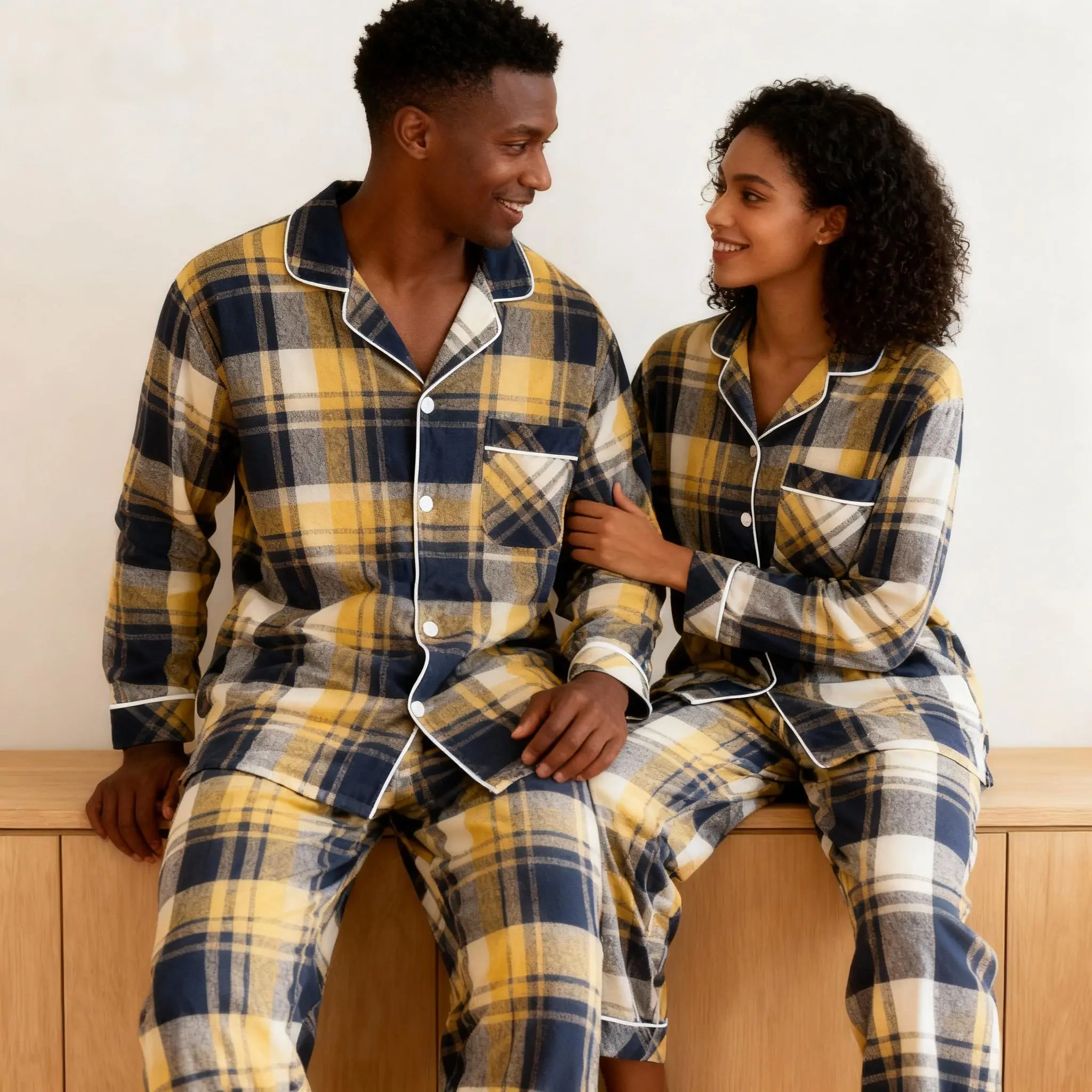 Matching Christmas Yellow and Blue Plaid Button Up Family Pajamas Sets