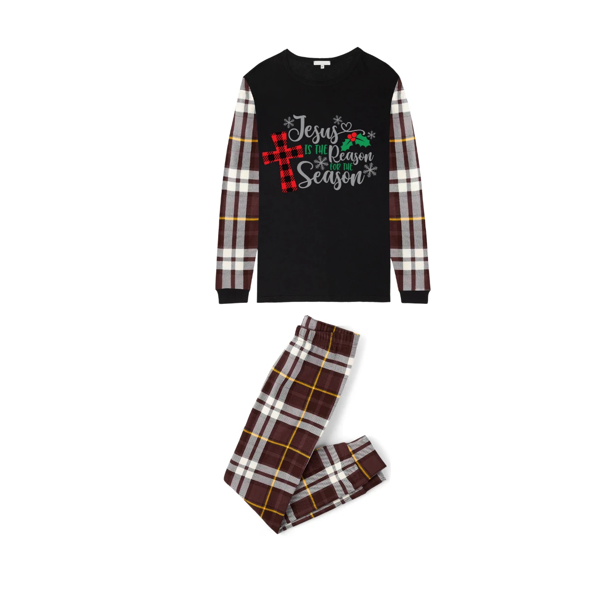 Matching Family Christmas Pajamas Jesus Is the Reason, Brown Plaid Sleeves