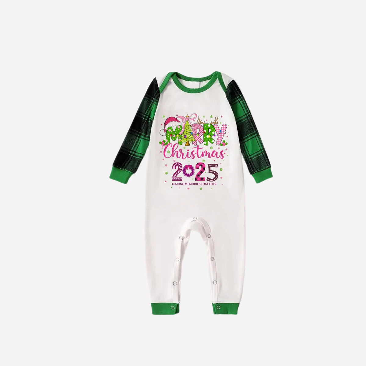 Merry Christmas 2025 Family Christmas Pajamas Set - White Top with Green Sleeves and Green Plaid Pants