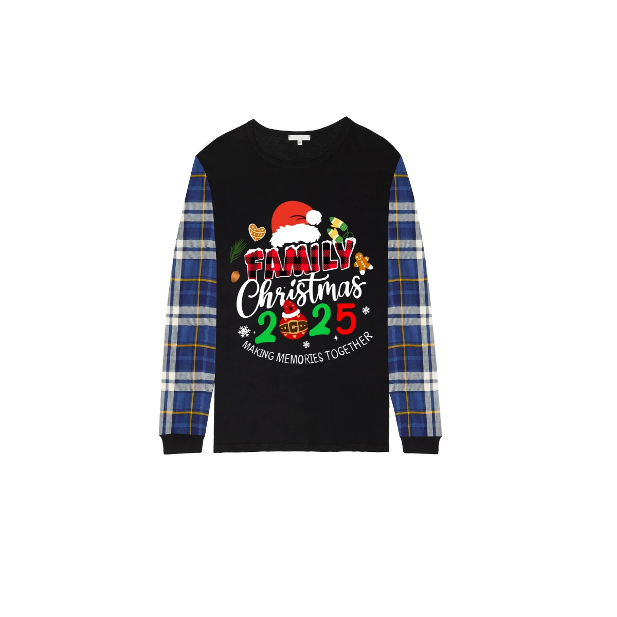 Merry Christmas 2025 Making Memories Family Pajamas Set - Black Top, Blue Pants, Blue Plaid Sleeves, Santa & Gingerbread Print