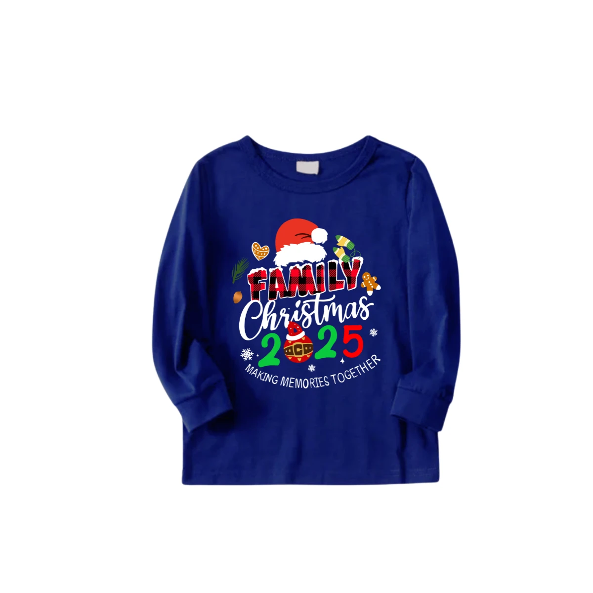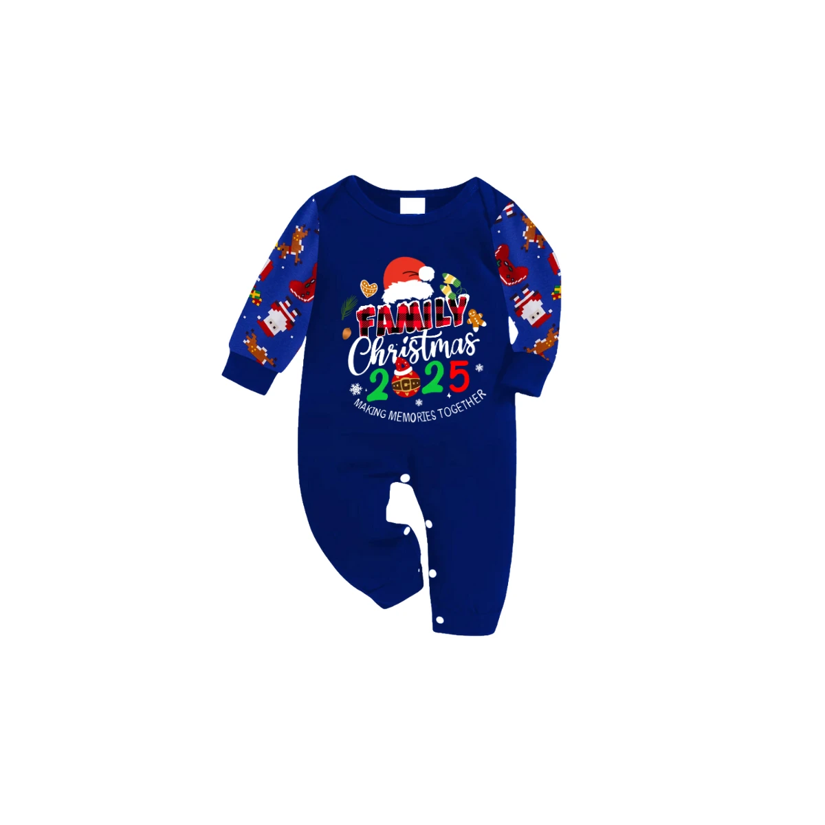 Merry Christmas 2025 Making Memories Family Pajamas Set - Blue Top, Blue Pants, Christmas Cartoon Sleeves, Santa & Gingerbread Print