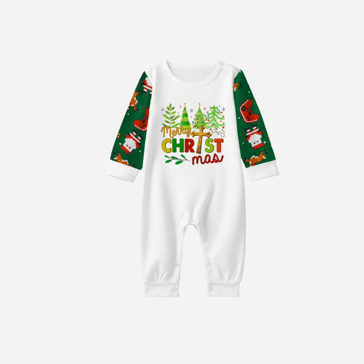 Merry Christmas Tree Family Pajamas Set - White Top Green Sleeves Green Santa Print Pants Multicolor Text Graphic