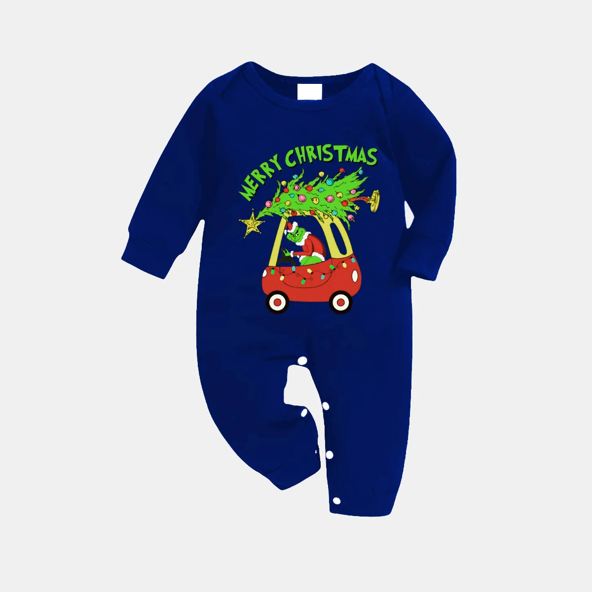 Navy & White Plaid Christmas Pajamas Set With Grinch and Christmas Tree Print