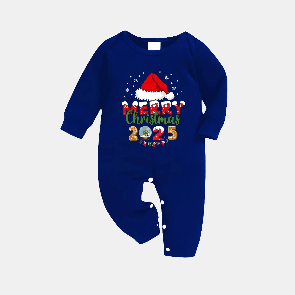 Navy & White Plaid Christmas Pajamas Set With Santa Hat and "Merry Christmas 2025" Text Print