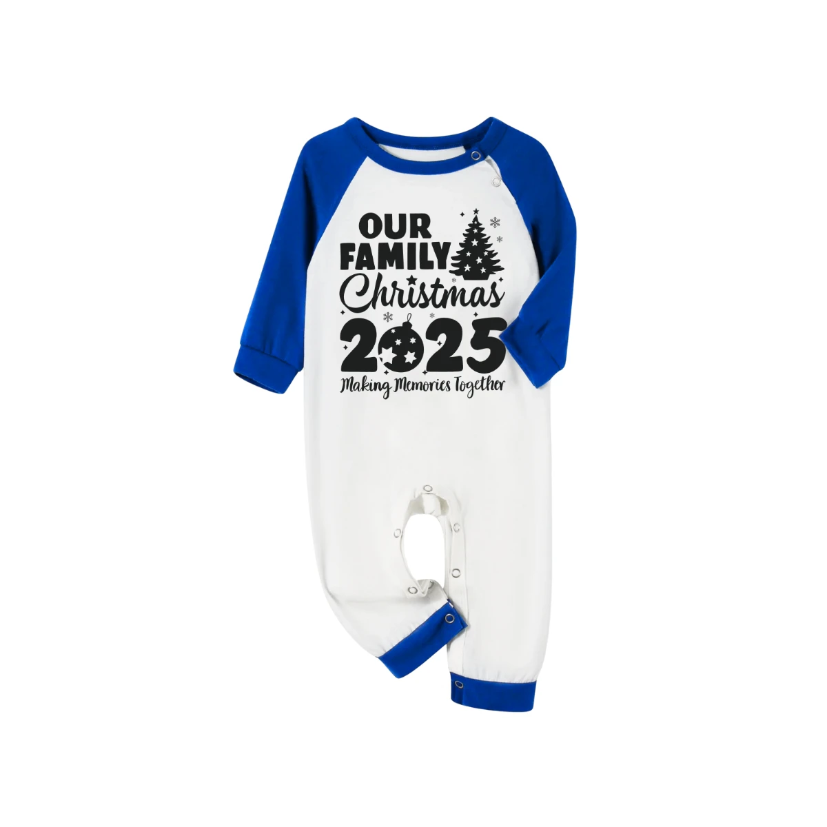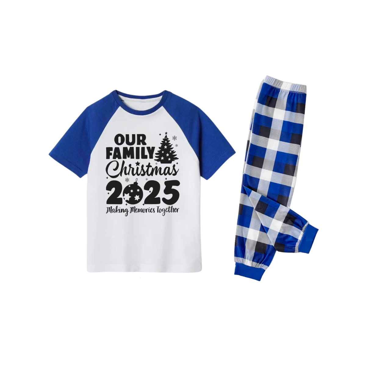 Our Family Christmas 2025 Family Pajamas Set - White Top, Blue Plaid Pants, Blue Sleeves, Christmas Tree and Ornaments Print