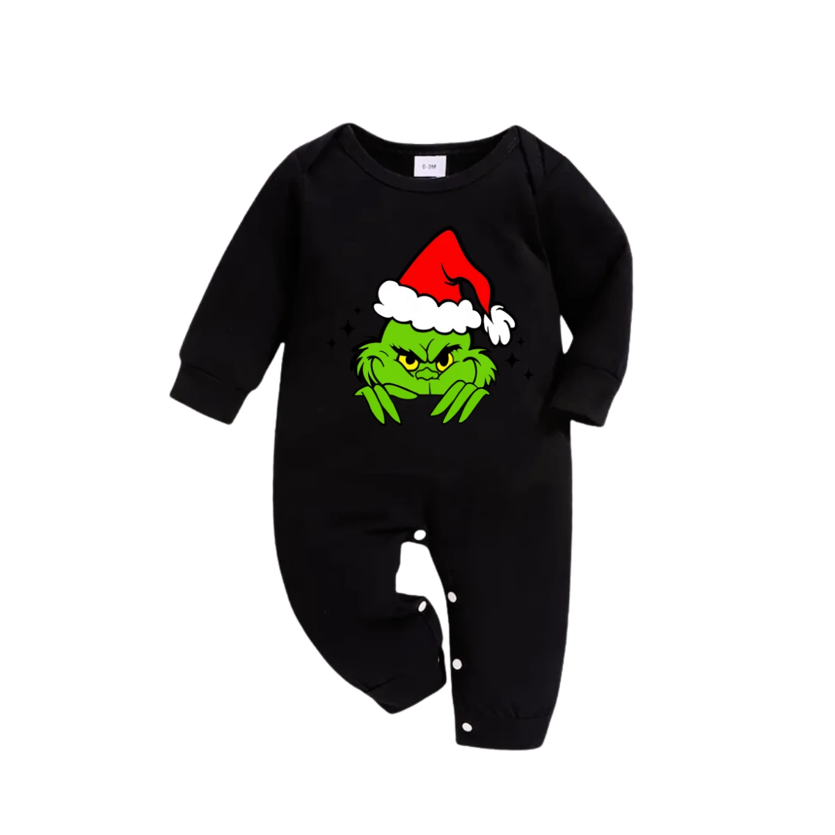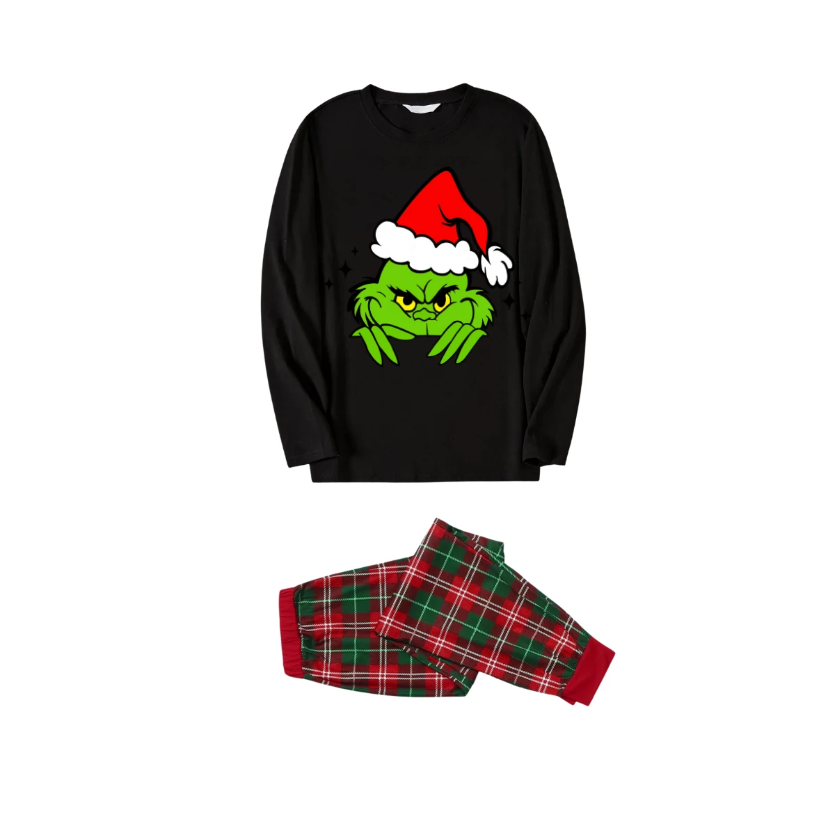 Green Cartoon Character with Red Hat Pattern Black Top Red and Green Plaid Family Matching Pajamas