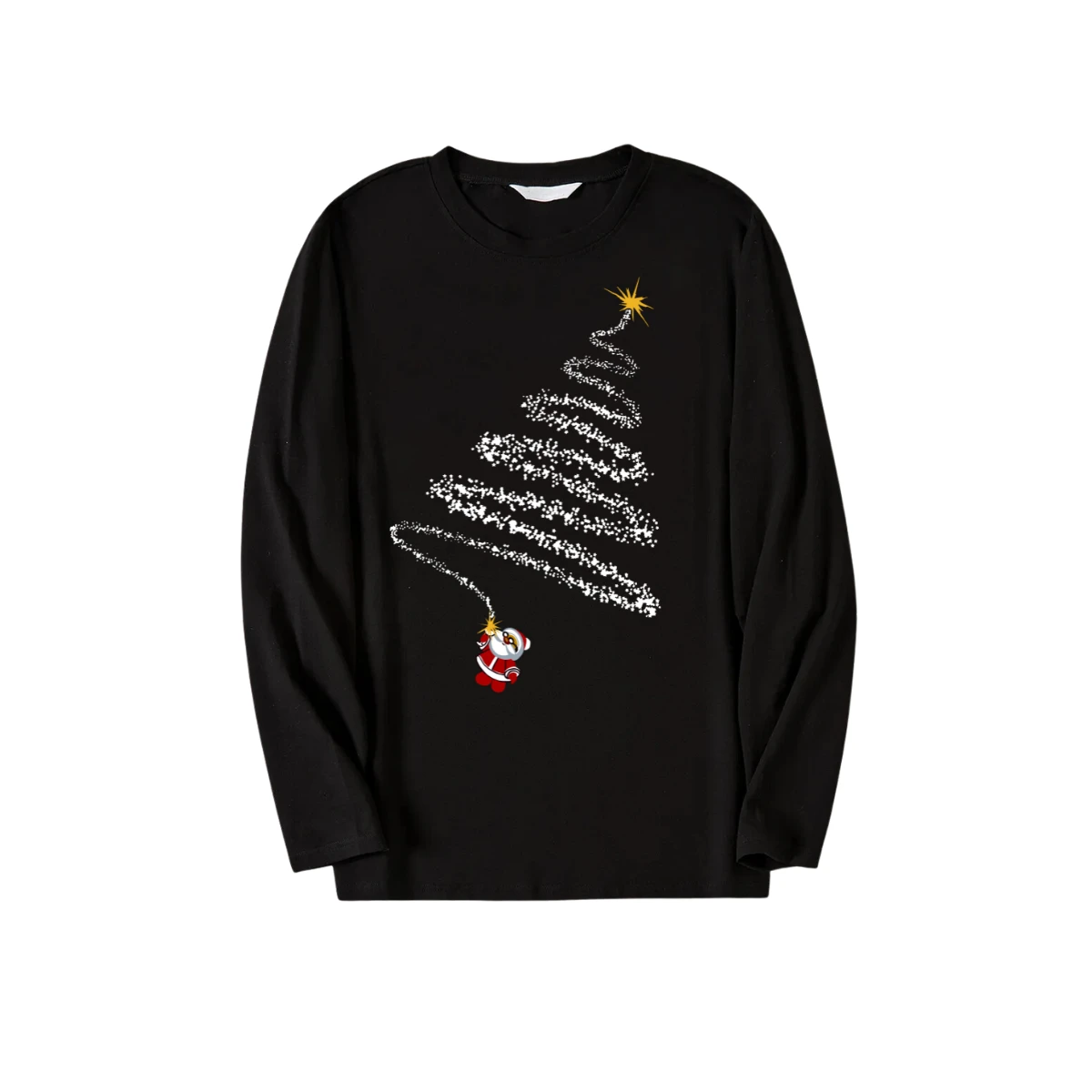 Santa Claus and Christmas Tree Print Black Long Sleeve Top with Green and Black Plaid Couple Matching Pajamas