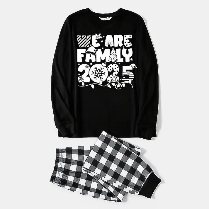 "We are Family 2025" White Letter Print Black Long Sleeve Top with Black And White Plaid Pants Family Matching Pajamas