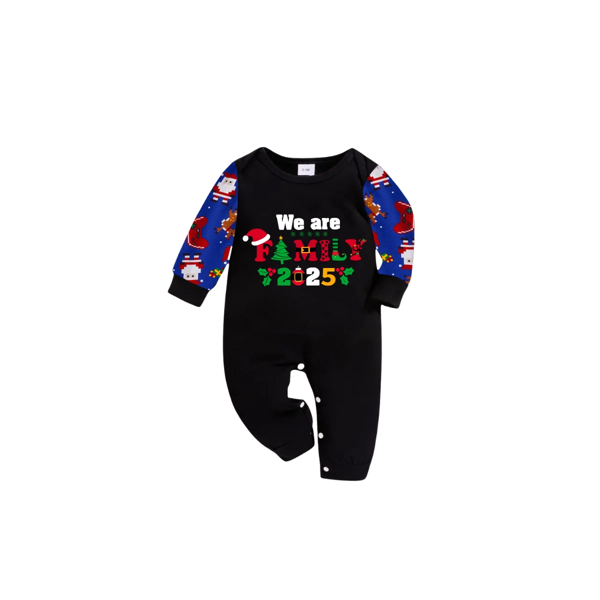 We Are Family Christmas 2025 Family Pajamas Set - Black Top, Blue Pants, Blue Christmas Cartoon Sleeves