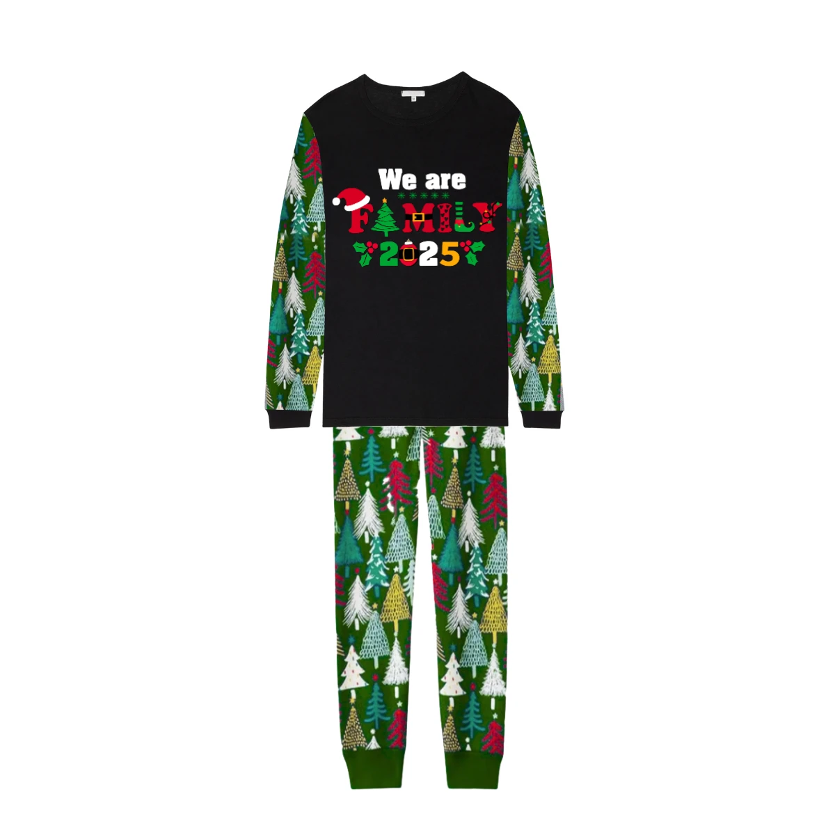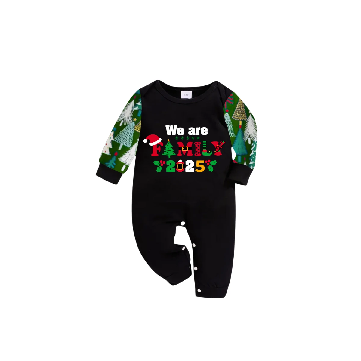 We Are Family Christmas 2025 Family Pajamas Set - Black Top, Green Pants, Christmas Tree Print Sleeves