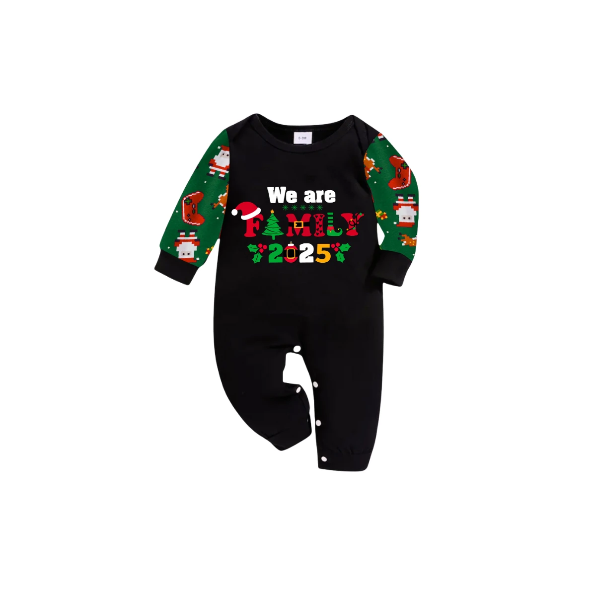 We Are Family Christmas 2025 Family Pajamas Set - Black Top, Green Pants, Green Christmas Cartoon Sleeves