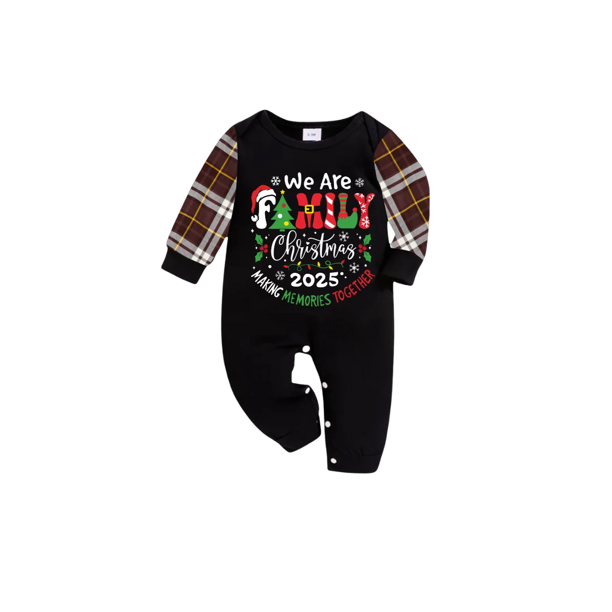 We Are Family Christmas 2025 Making Memories Family Pajamas Set - Black Top, Brown Pants, Brown Plaid Sleeves