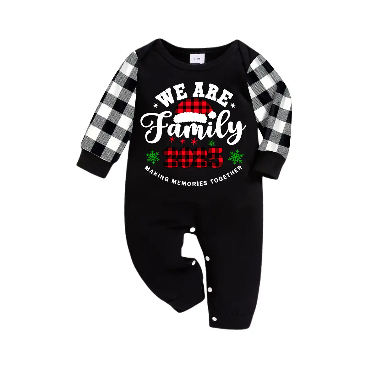 "We are Family2025" Santa Hat Monogram Print Black Long Sleeve Top with Black And White Plaid Pants Family Matching Pajamas