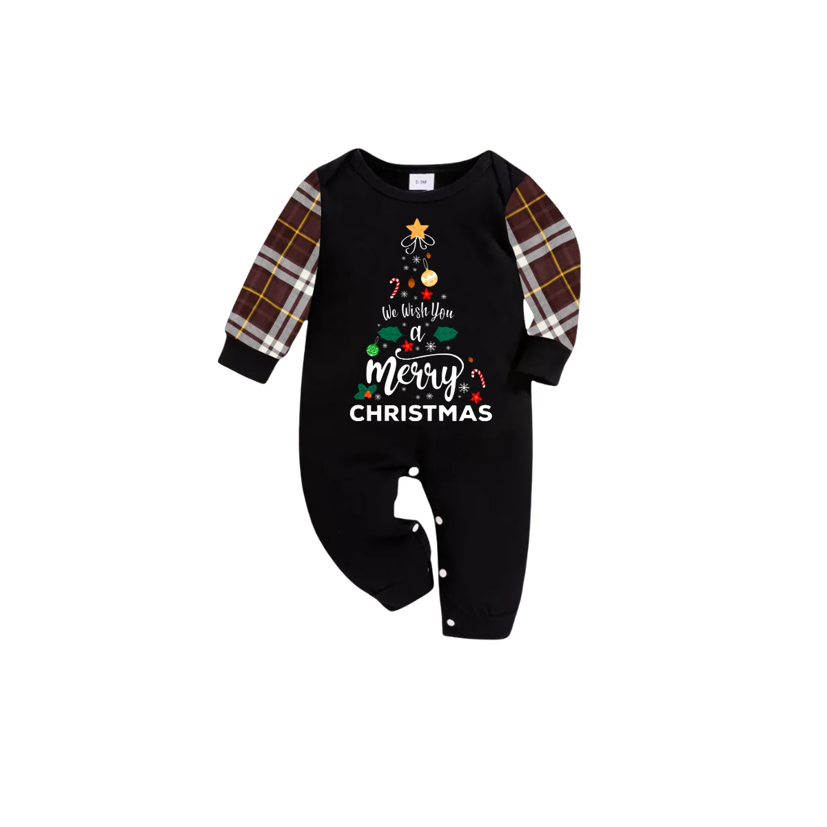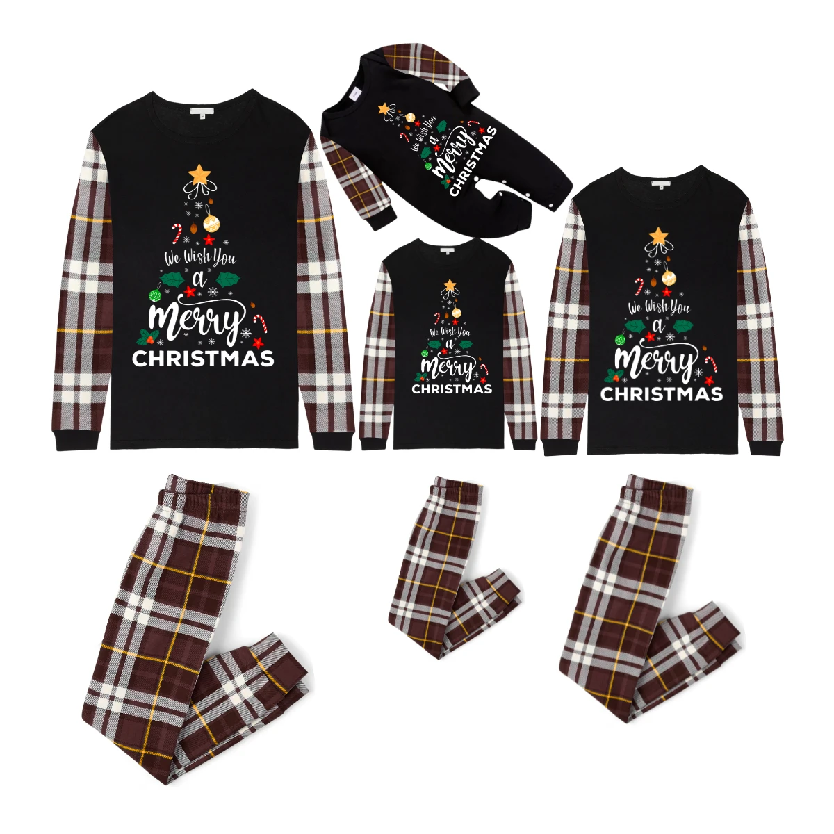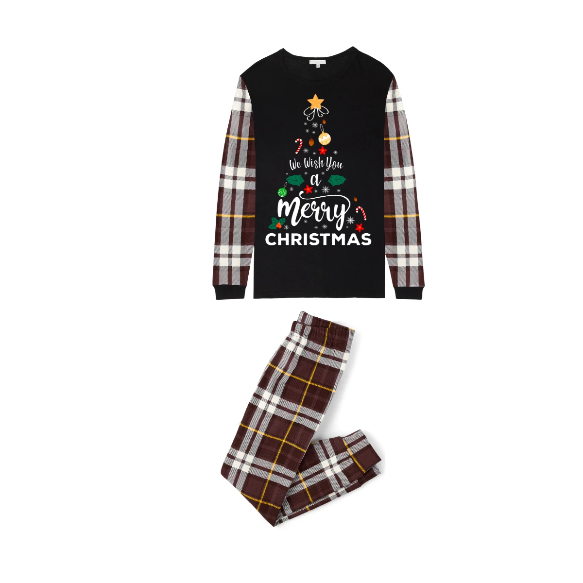 We Wish You a Merry Christmas Family Pajamas Set - Black Top / Brown Plaid Pants / Brown Plaid Sleeves
