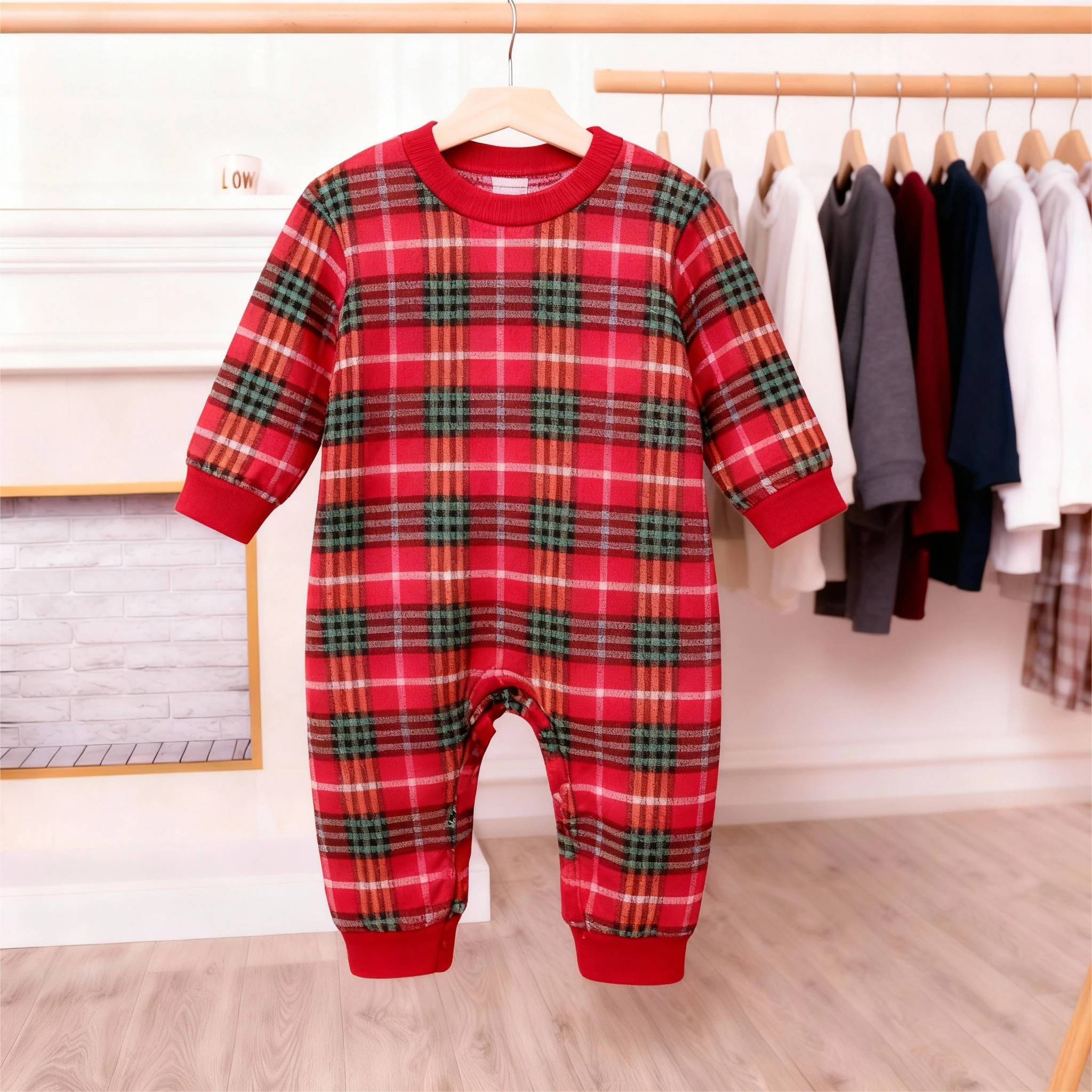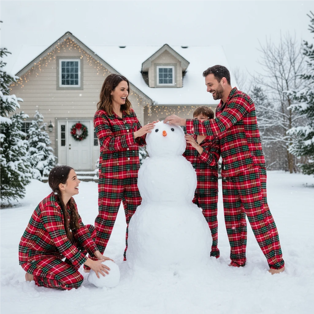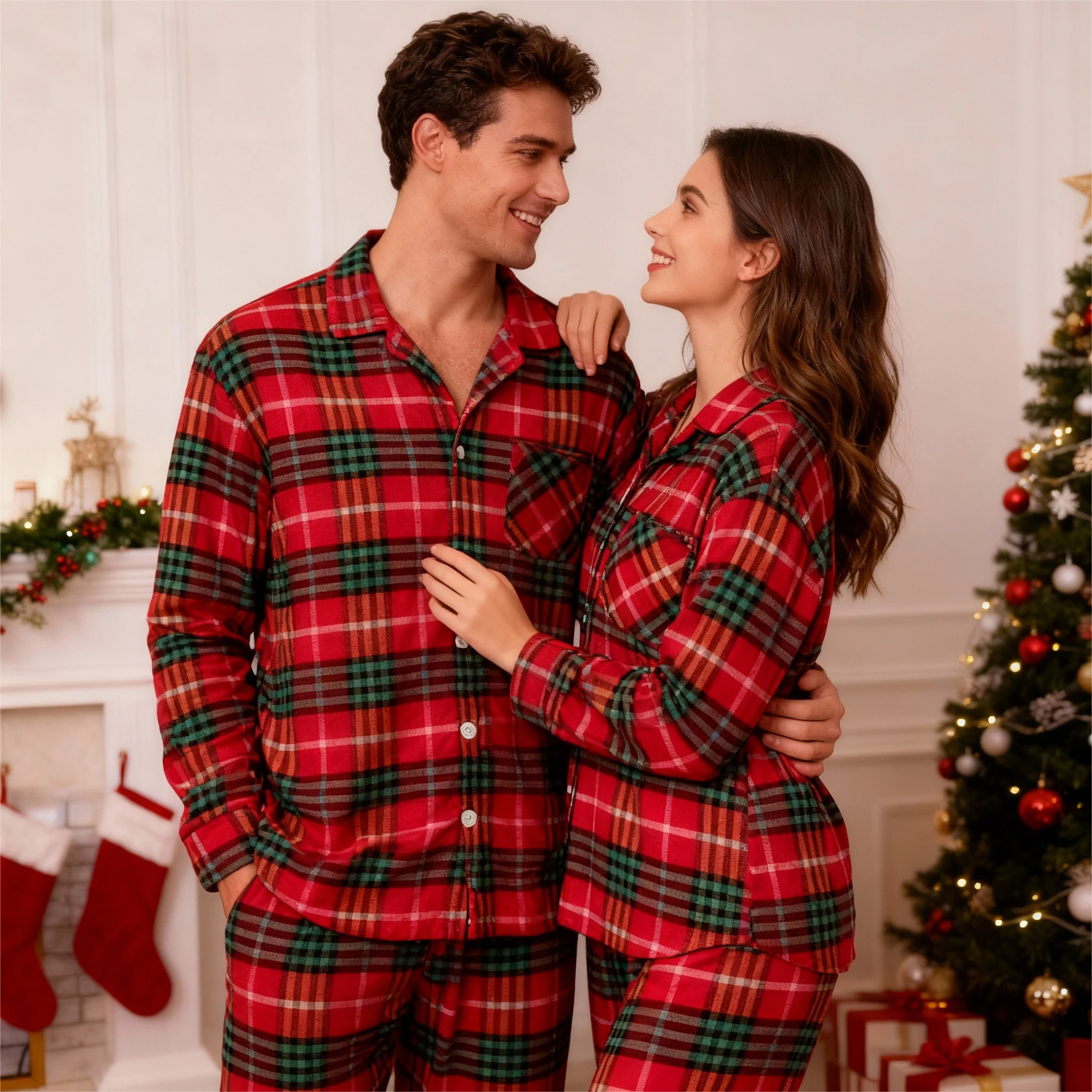 Festive Red and Green Plaid Button-Up Pajamas Set for Family