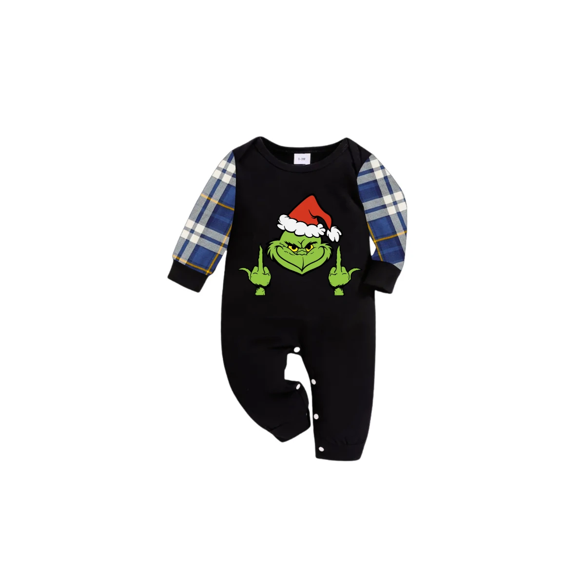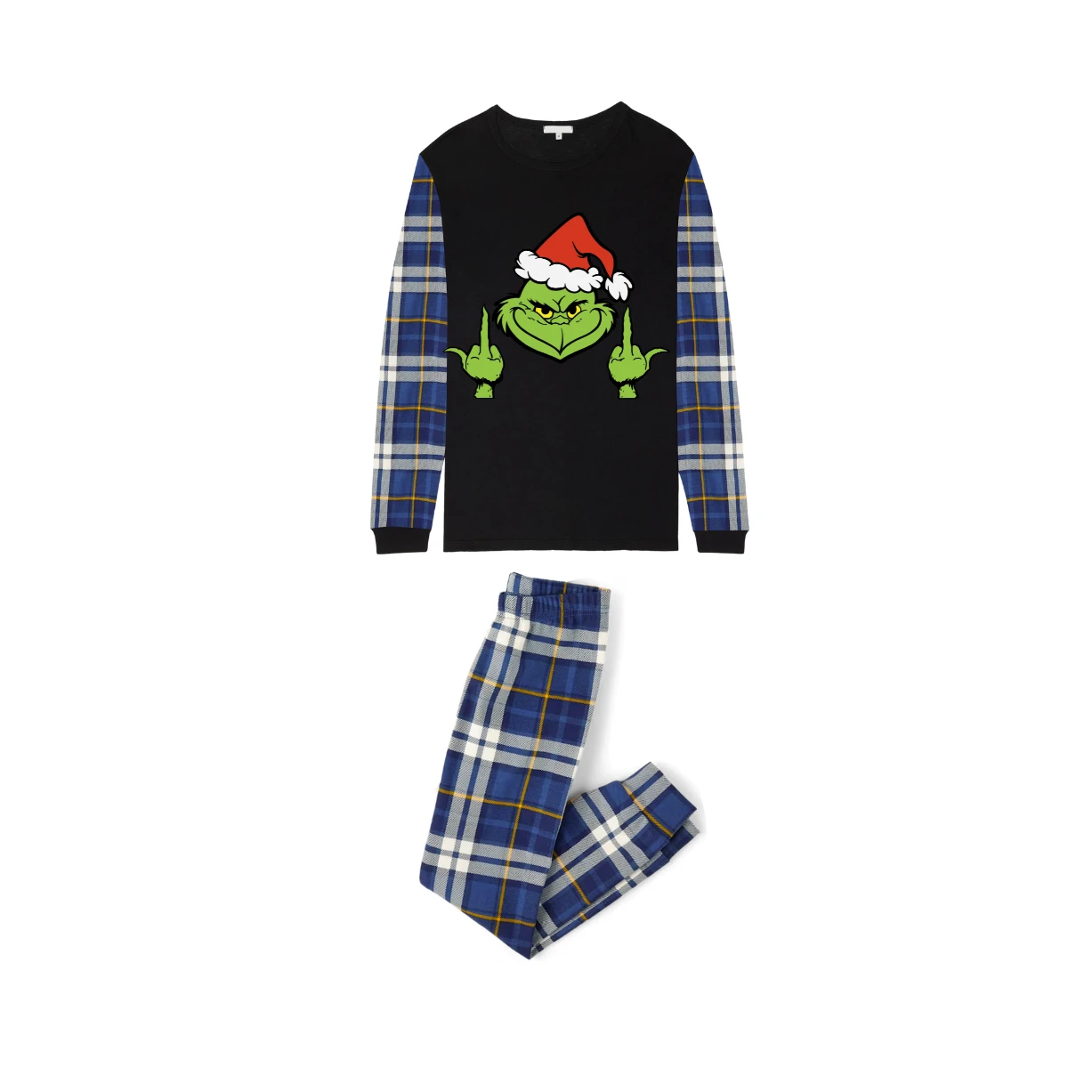 Grinch Santa Middle Finger Family Christmas Pajamas Black Top with Blue Plaid Pants