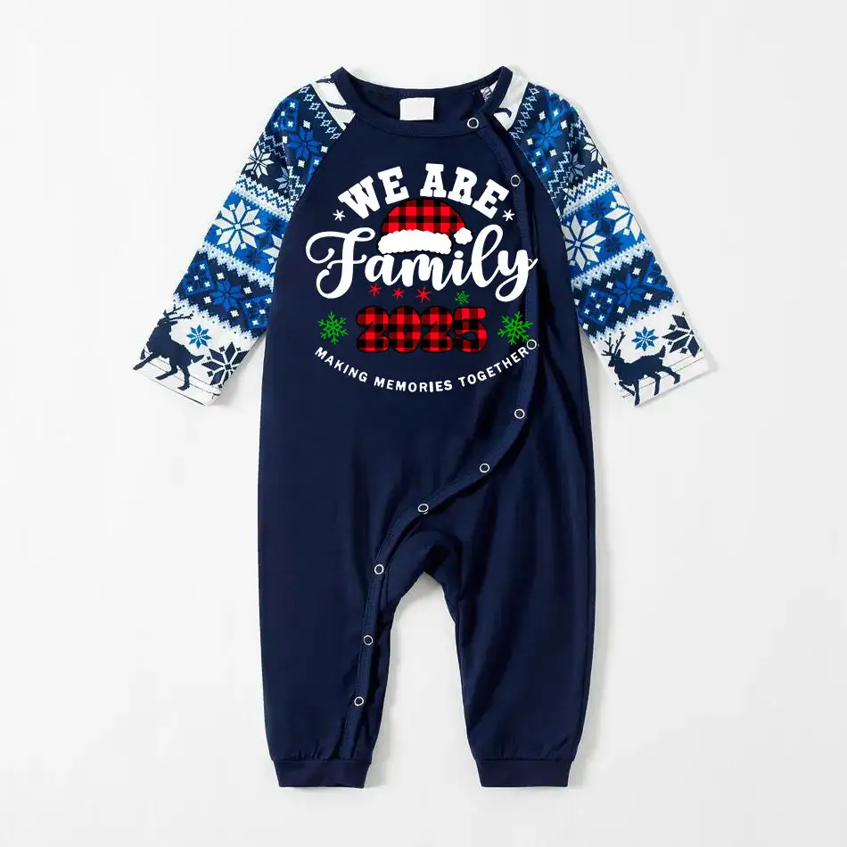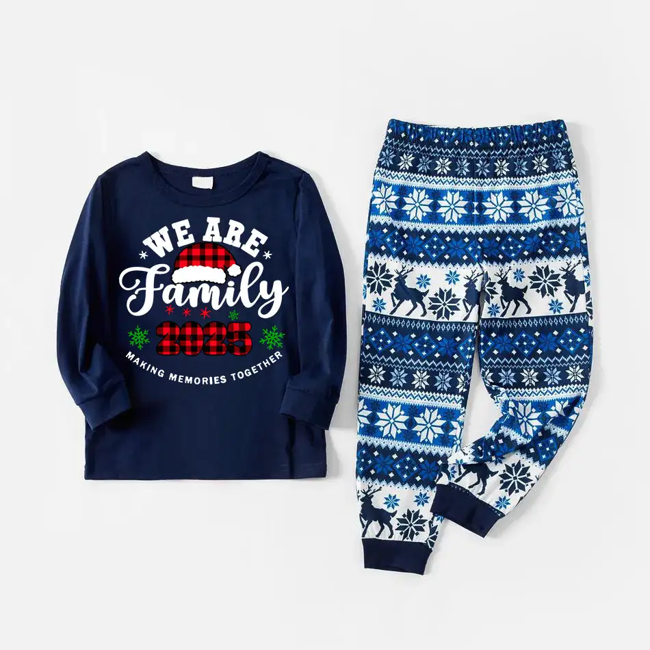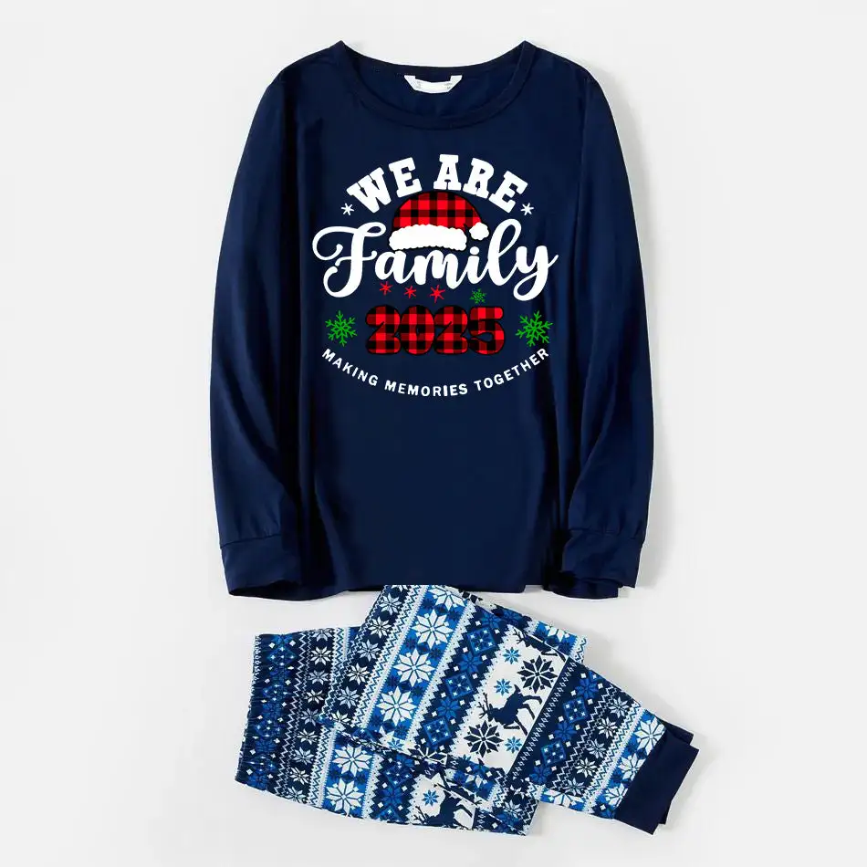 "We are Family2025" Santa Hat Monogram Print Letter Blue Long Sleeve Family Matching Pajamas With Dog bandana