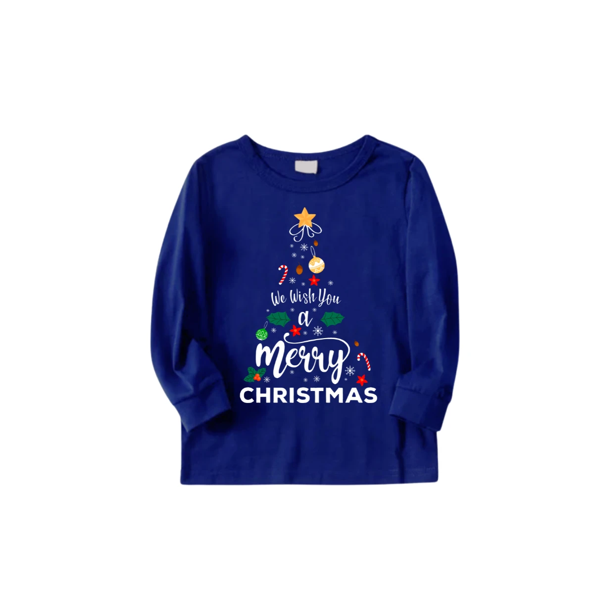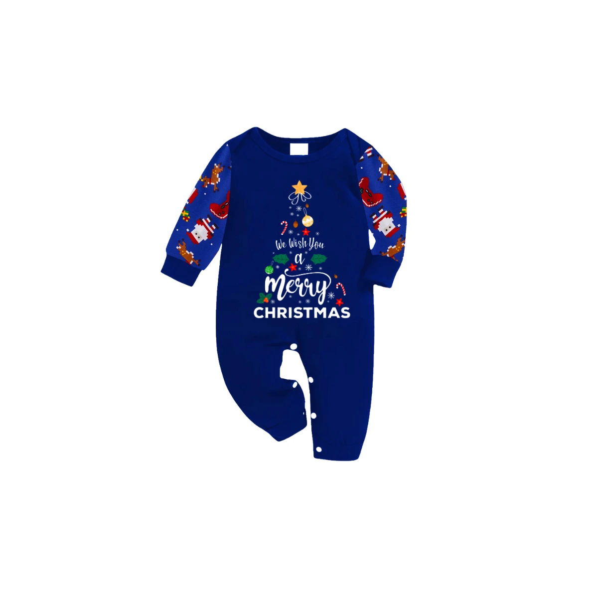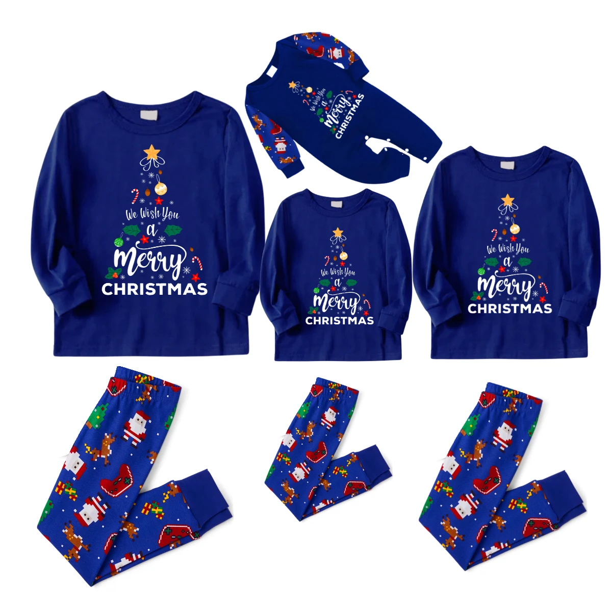 We Wish You a Merry Christmas Family Pajamas Set - Blue Top / Santa and Reindeer Print Blue Pants / Matching Blue Sleeves